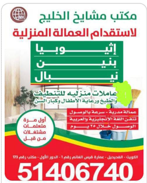 مكتب مشايخ الخليج لاستقدام العمالة المنزلية - أثيوبيا - بنين - نيبال - عاملات منزلية للتنظيف والطبخ ورعاية الأطفال كبار السن - عمالة مدربة - سرعة بالوصول